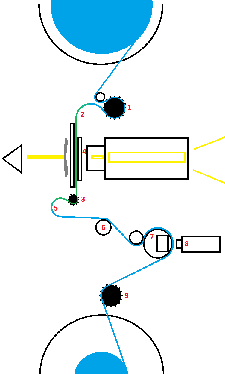 Die darauf folgende Filmschlaufe (5) gleicht den Filmstau aus, wenn es wieder in den gleichmäßigen Filmzug geht. Ab hier wird der Film von der Bremsrolle (6) beruhigt, damit er komplett ruhig und sauber mit der Tonrolle (7) am Tonlesegerät (8) vorbeigeführt wird. Zuletzt wartet noch die Nachwickelrolle (9), die den Film abermals gleichmäßig auf die (Aufwickel-)Filmspule schickt.